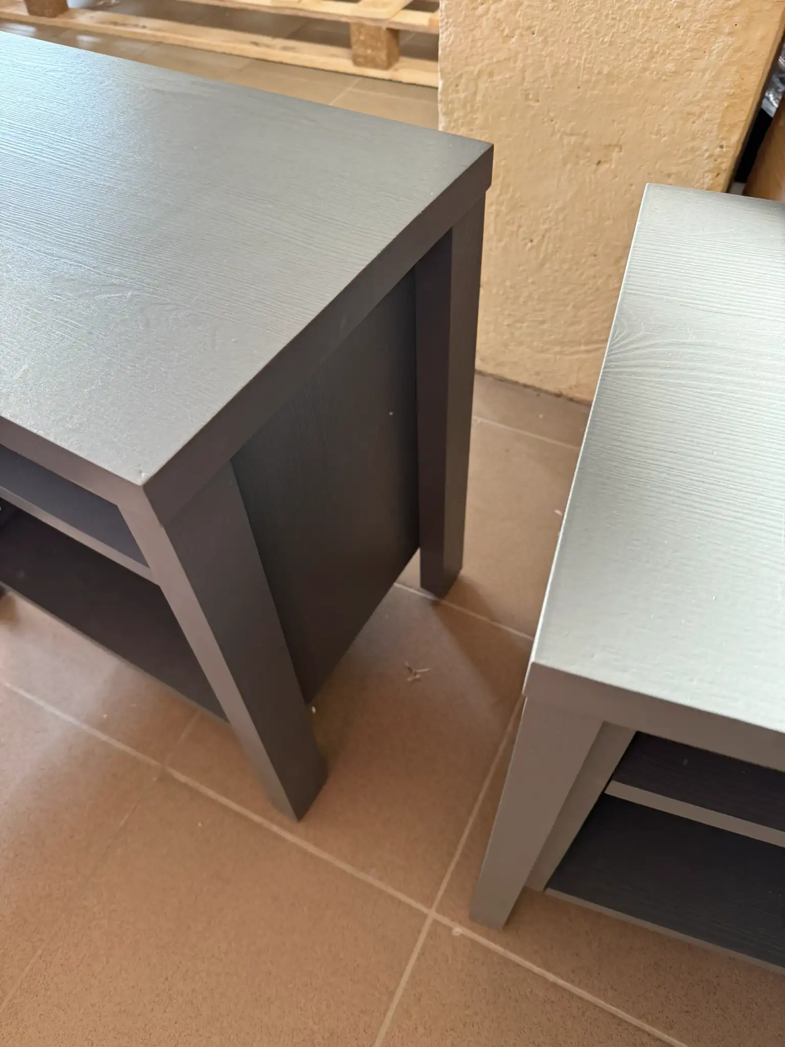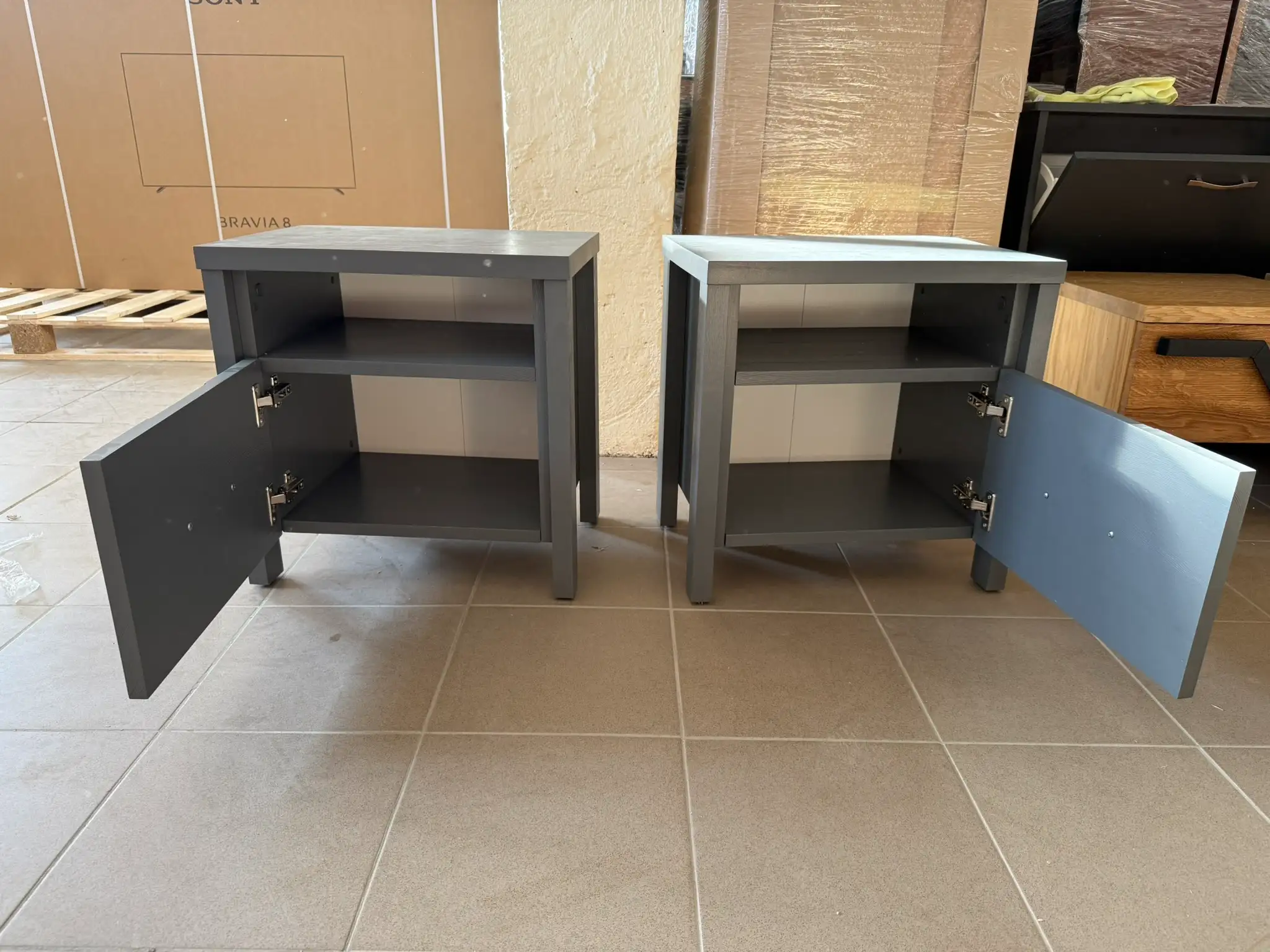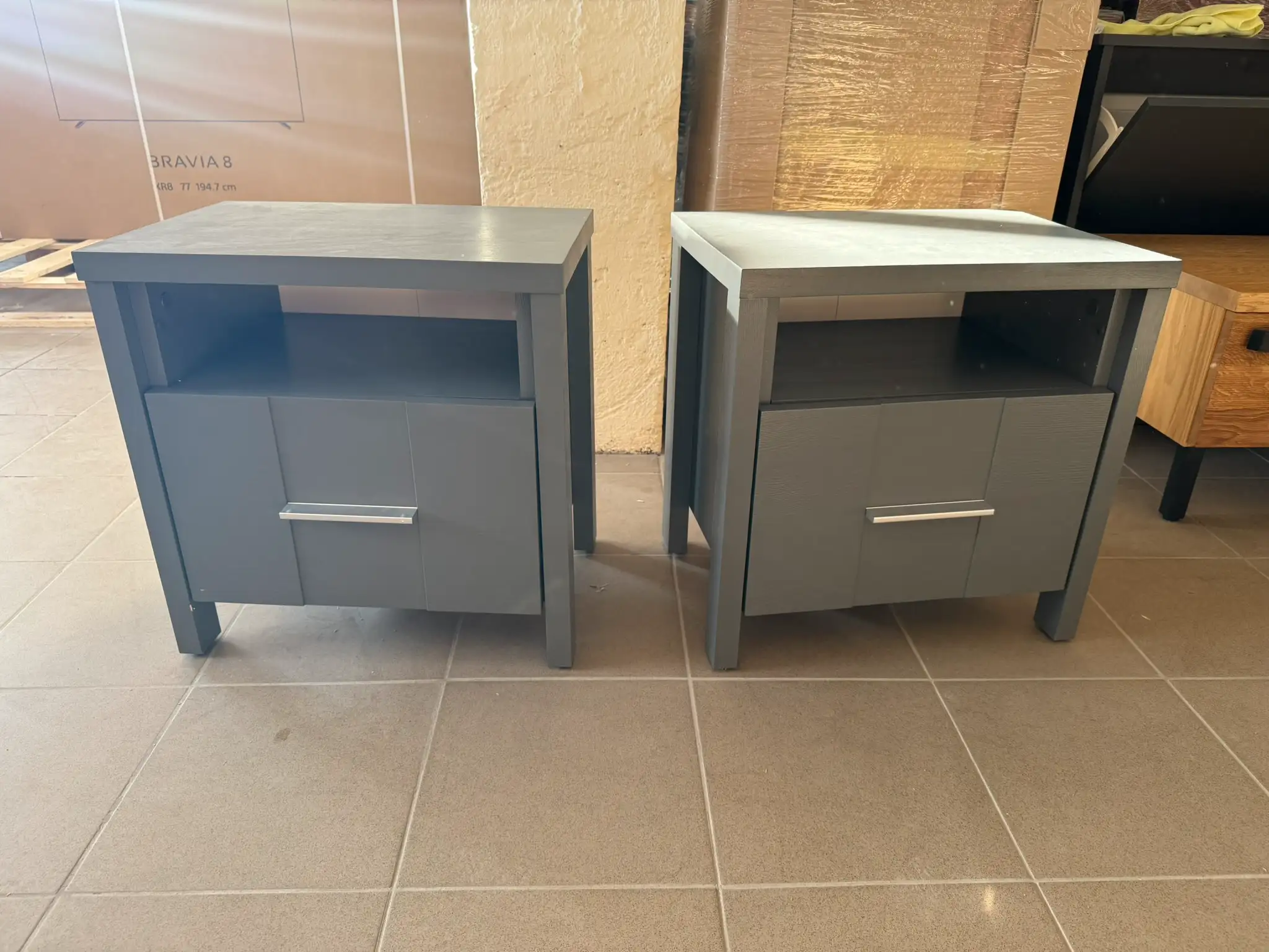 Oferuję komplet dwóch stolików nocnych Laura w eleganckim, antracytowym wykończeniu. Meble pochodzą z ekspozycji i są w bardzo dobrym stanie wizualnym i użytkowym – stabilne, bez uszkodzeń i gotowe do codziennego użytku.