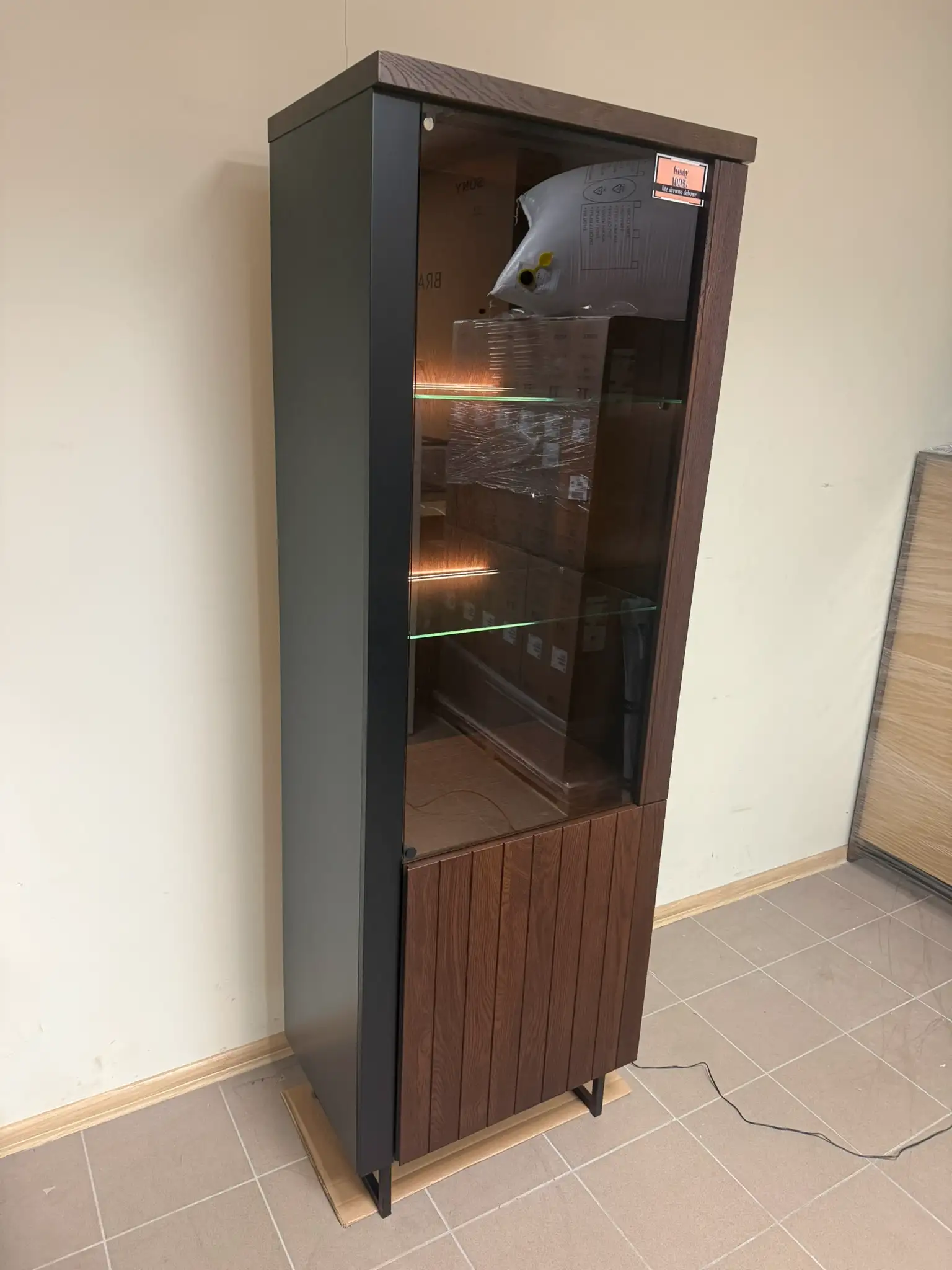 Witryna doskonale sprawdzi się w salonie lub jadalni jako elegancki mebel do ekspozycji szkła, dekoracji lub książek. Przeszklona część z oświetleniem LED nadaje wnętrzu wyjątkowego klimatu, a zamykane przestrzenie zapewniają funkcjonalne miejsce do przechowywania.