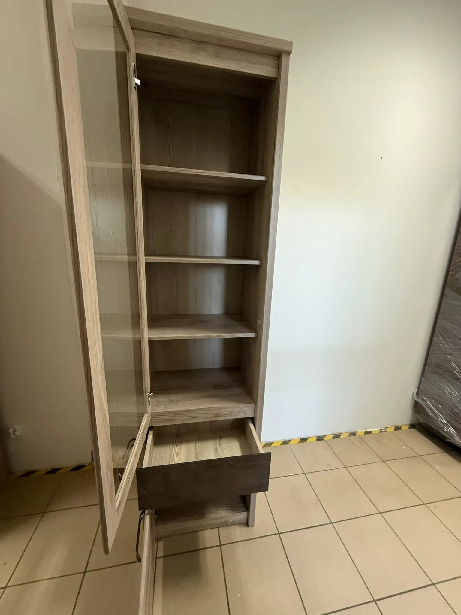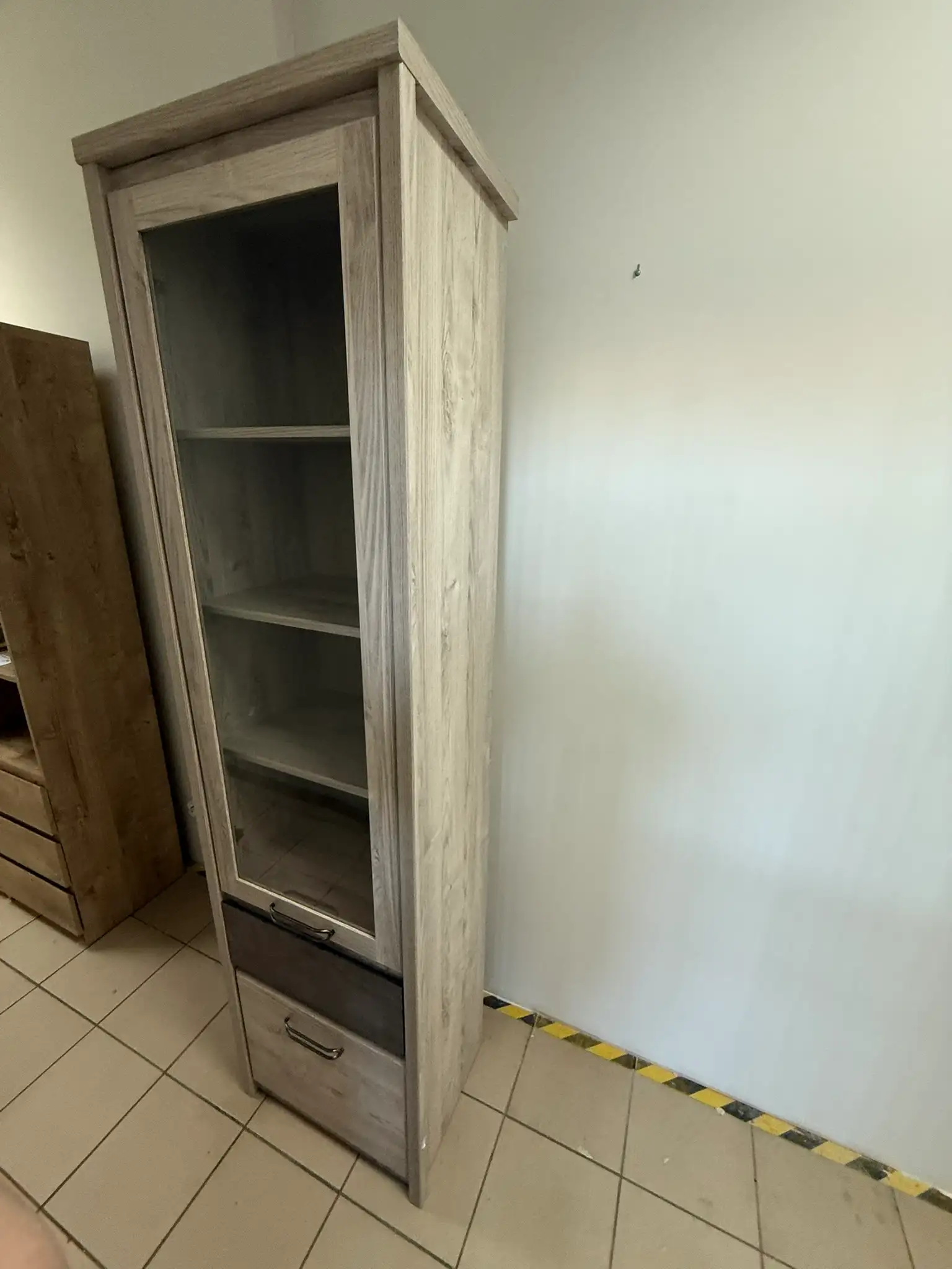 Witryna wyposażona jest w przeszkloną półkę do ekspozycji dekoracji oraz praktyczną szafkę i szufladę, dzięki czemu łączy funkcjonalność z estetyką. Doskonale sprawdzi się zarówno jako mebel użytkowy, jak i dekoracyjny element wnętrza.