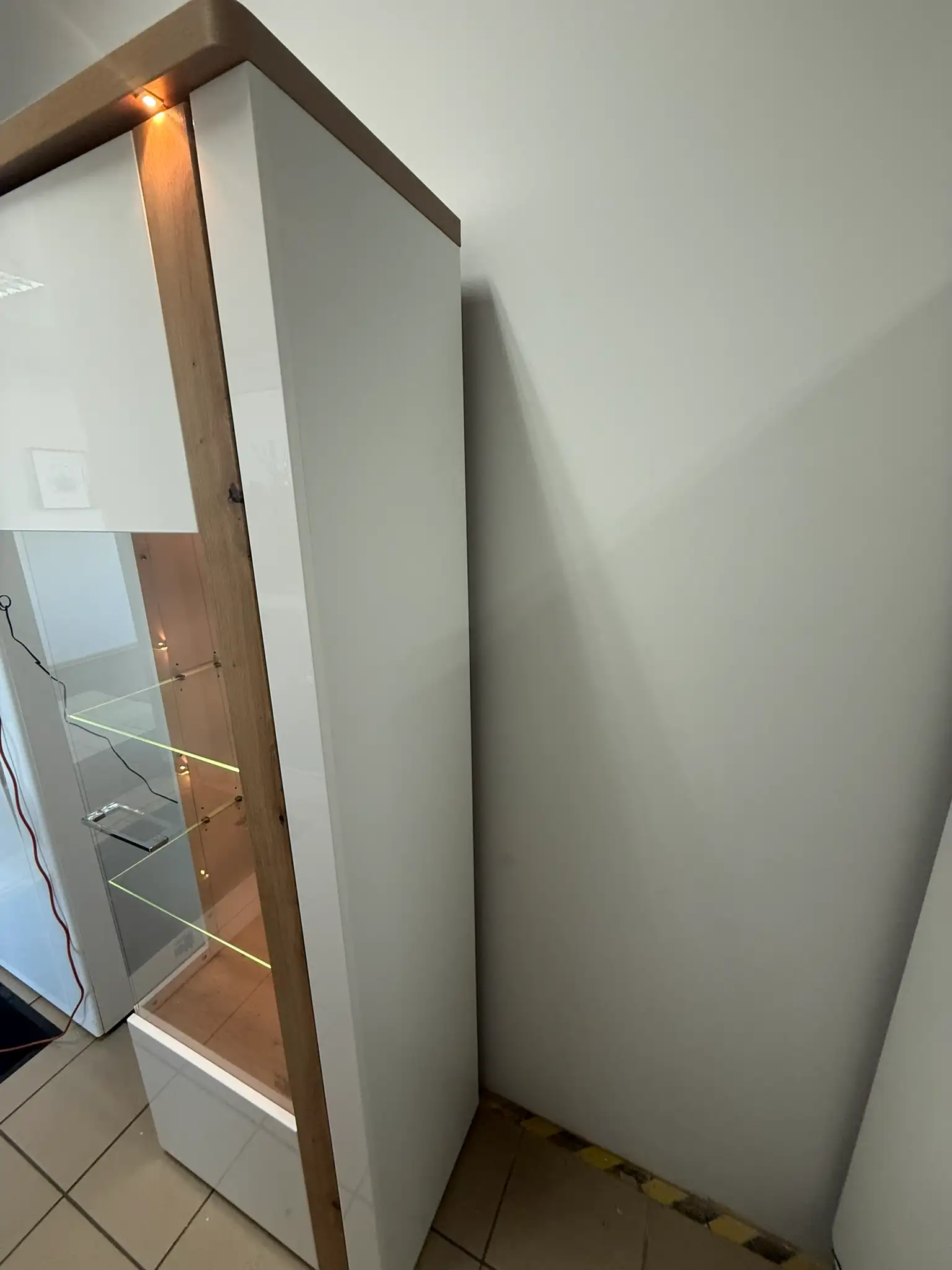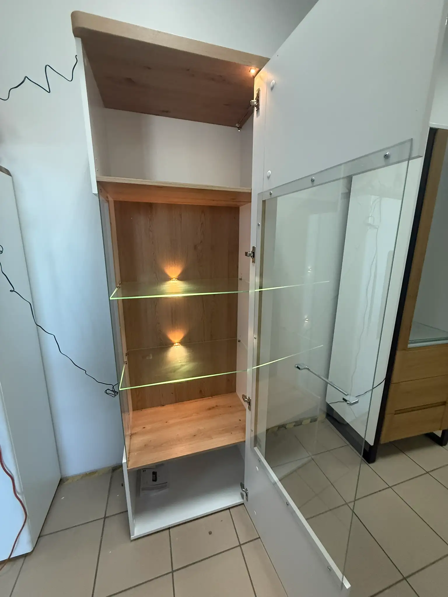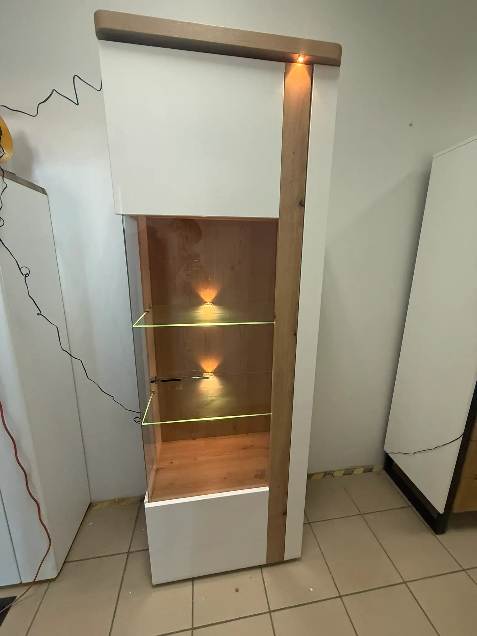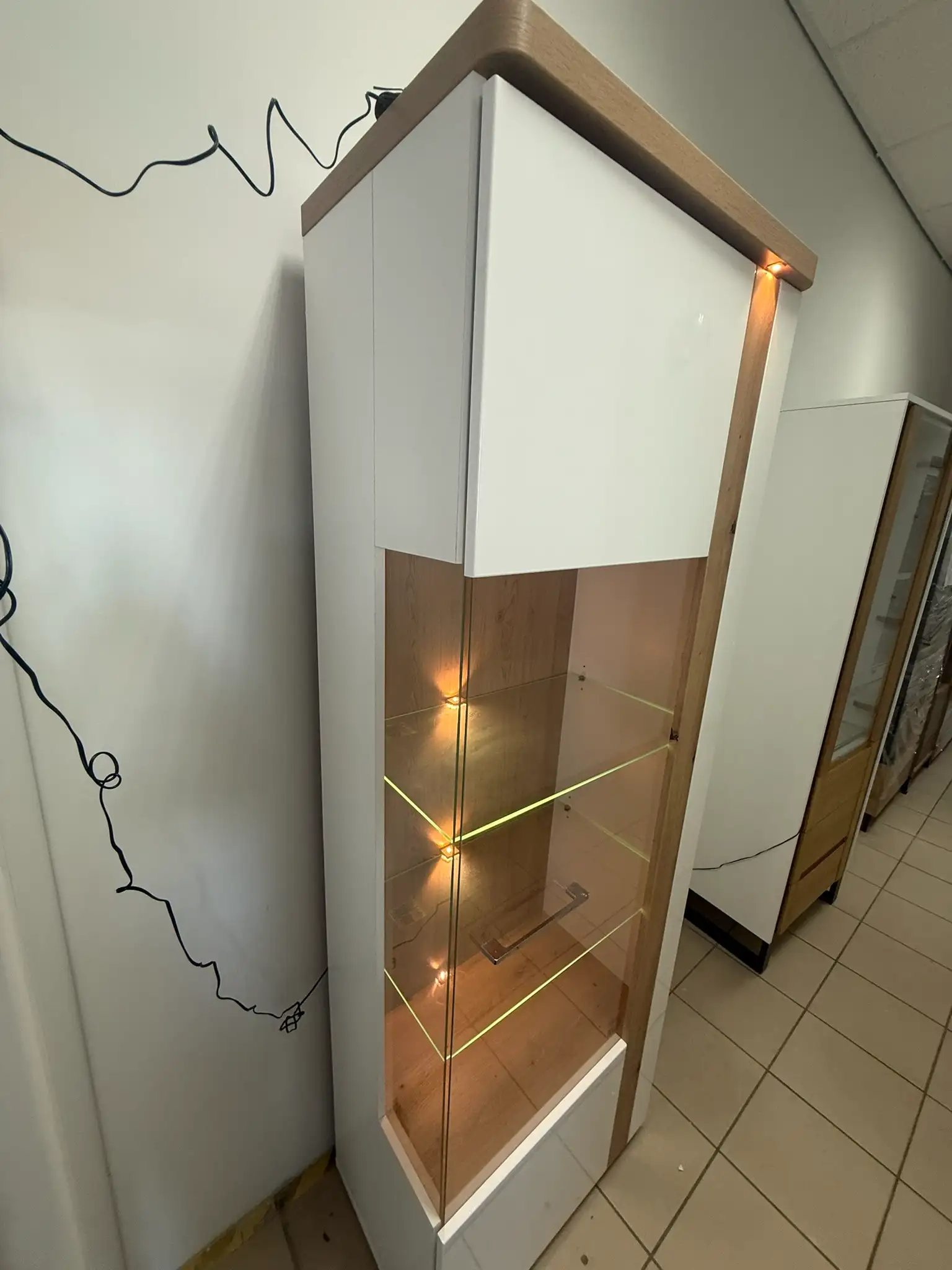 Witryna powystawowa w bardzo dobrym stanie. Od boku, przy krawędzi drzwi, widoczny jest niewielki odprysk powierzchni wykończeniowej, powstały podczas ekspozycji/transportu. Uszkodzenie ma charakter wyłącznie wizualny i nie wpływa na funkcjonalność, pracę drzwi ani stabilność mebla. Cena została odpowiednio obniżona z uwzględnieniem tej niedoskonałości.